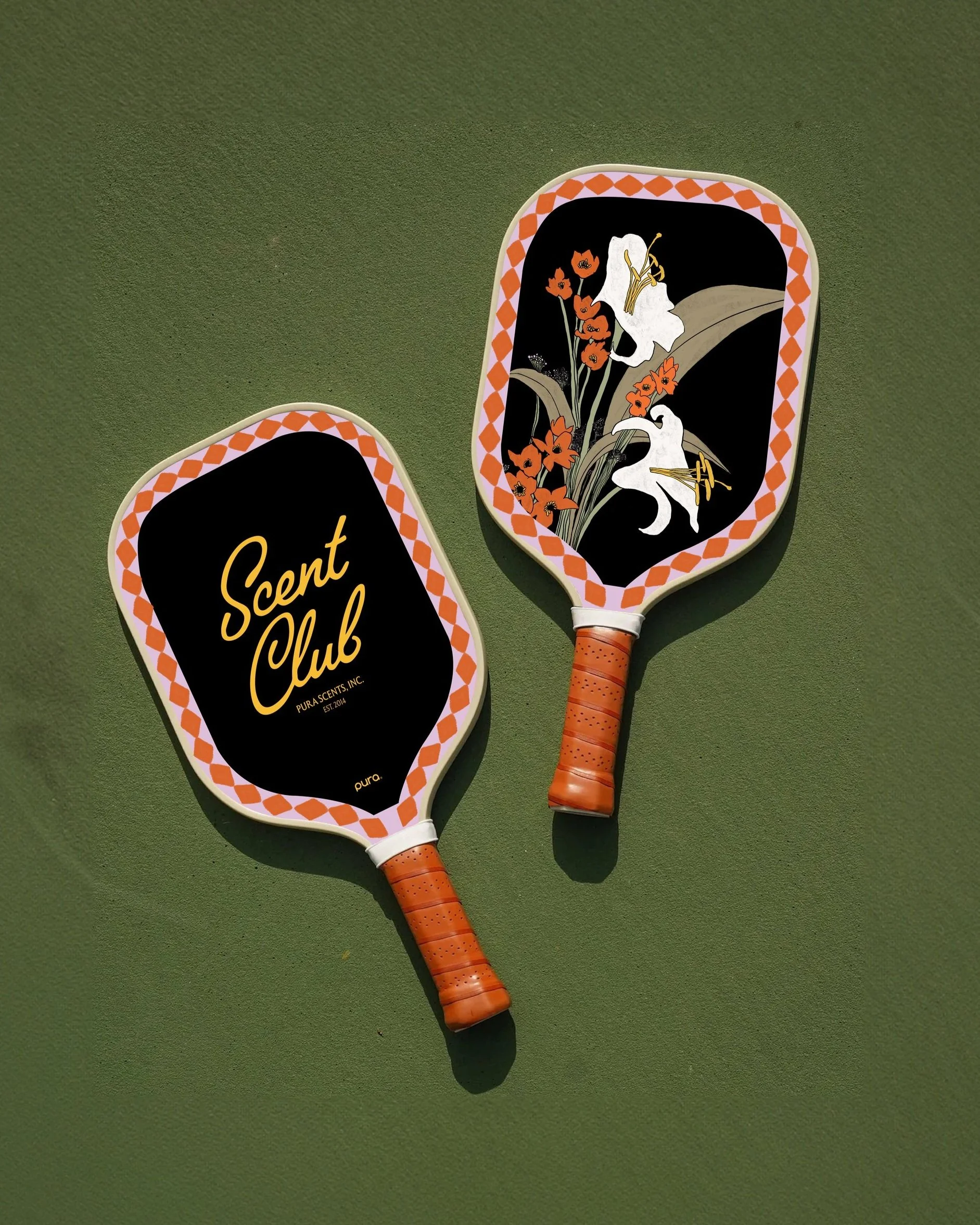 The Pura Scent Club pickleball paddles were designed for an employee summer swag bag. I aimed to create a playful, summery vibe with a beach club aesthetic.